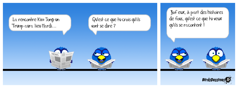 Case 1:Bird 1: La rencontre Kim Jong-un Trump aura lieu Mardi... | Case 2: Bird 1: Qu'est ce que tu crois qu'ils vont se dire ? | Case 3: Bird 1: Bof eux, à part des histoires de fous, qu'est ce que tu veux qu'ils se racontent !