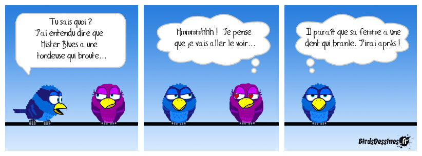 Case 1:Bird 1: Tu sais quoi ? J'ai entendu dire que Mister Blues a une tondeuse qui broute... | Case 2: Bird 1: Mmmmmhhh ! Je pense que je vais aller le voir... | Case 3: Bird 1: Il paraït que sa femme a une dent qui branle. J'irai après !