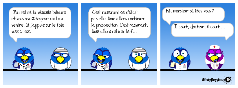 Case 1:Bird 1: J'ai retiré la vésicule biliaire et vous avez toujours mal au ventre. Si j'appuie sur le foie vous criez. | Case 2: Bird 1: C'est rassurant ce n'était pas elle. Nous allons continuer la prospection. C'est rassurant. Nous allons retirer le f... | Case 3: Bird 1: Hé, monsieur où êtes-vous ? Bird 2: Il court, docteur, il court ...