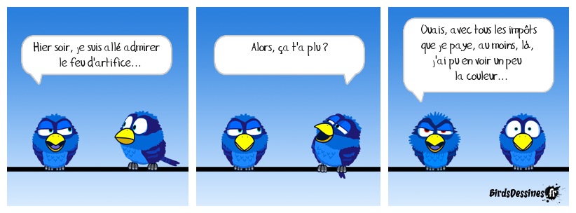 Case 1:Bird 1: Hier soir, je suis allé admirer le feu d'artifice... | Case 2: Bird 1: Alors, ça t'a plu ? | Case 3: Bird 1: Ouais, avec tous les impôts que je paye, au moins, là, j'ai pu en voir un peu la couleur...