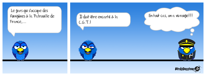 Case 1:Bird 1: Le gars qui s'occupe des fumigènes à la Patrouille de France,... | Case 2: Bird 1: Il doit être encarté à la C.G.T.! | Case 3: Bird 1: En tout cas, on a vu rouge!!!