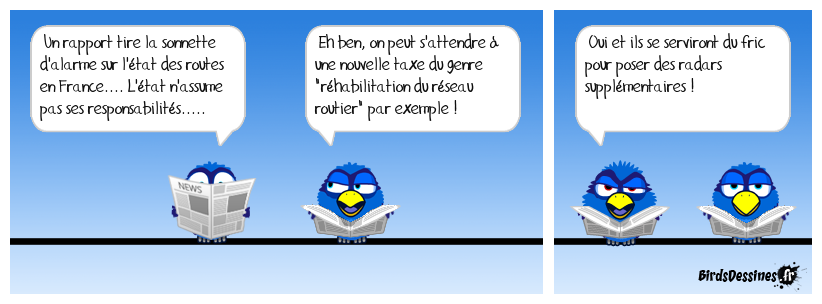 Case 1:Bird 1: Un rapport tire la sonnette d'alarme sur l'état des routes en France.... L'état n'assume pas ses responsabilités..... | Case 2: Bird 1: Eh ben, on peut s'attendre à une nouvelle taxe du genre "réhabilitation du réseau routier" par exemple ! | Case 3: Bird 1: Oui et ils se serviront du fric pour poser des radars supplémentaires !