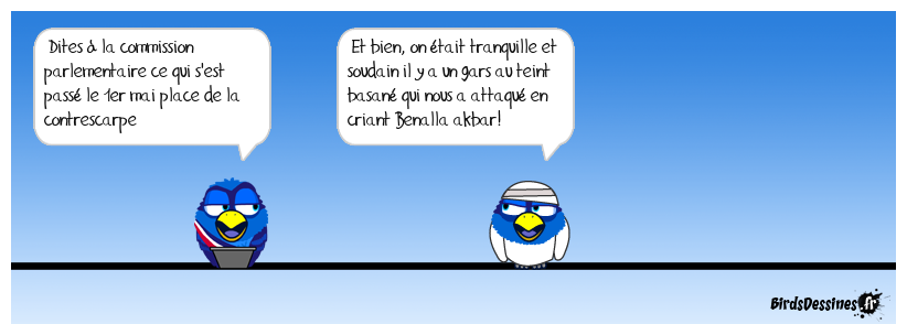 Case 1:Bird 1: Dites à la commission parlementaire ce qui s'est passé le 1er mai place de la contrescarpe | Case 2: Bird 1: Et bien, on était tranquille et soudain il y a un gars au teint basané qui nous a attaqué en criant Benalla akbar! | Case 3: