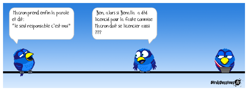 Case 1:Bird 1: Macron prend enfin la parole et dit: “le seul responsable c’est moi” | Case 2: Bird 1: Ben, alors si Benalla a été licencié pour la faute commise Macron doit se licencier aussi ??? | Case 3:
