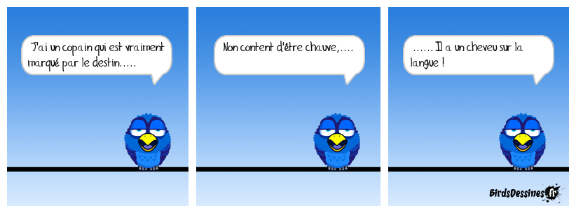 Case 1:Bird 1: J'ai un copain qui est vraiment marqué par le destin..... | Case 2: Bird 1: Non content d'être chauve,.... | Case 3: Bird 1: ...... Il a un cheveu sur la langue !