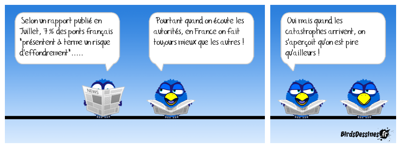 Case 1:Bird 1: Selon un rapport publié en Juillet, 7 % des ponts français "présentent à terme un risque d'effondrement"..... | Case 2: Bird 1: Pourtant quand on écoute les autorités, en France on fait toujours mieux que les autres ! | Case 3: Bird 1: Oui mais quand les catastrophes arrivent, on s'aperçoit qu'on est pire qu'ailleurs !
