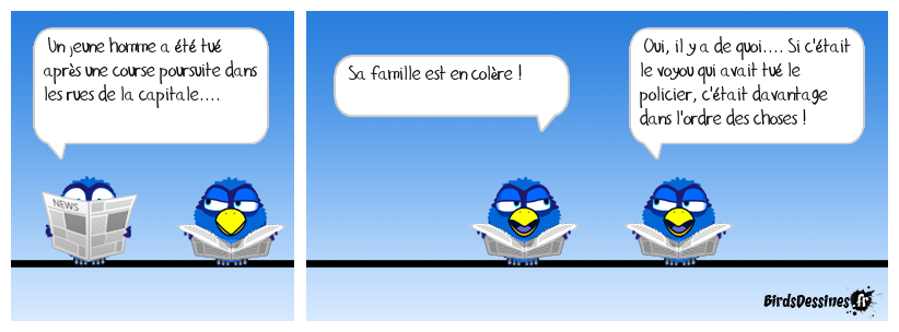 Case 1:Bird 1: Un jeune homme a été tué après une course poursuite dans les rues de la capitale.... | Case 2: Bird 1: Sa famille est en colère ! | Case 3: Bird 1: Oui, il y a de quoi.... Si c'était le voyou qui avait tué le policier, c'était davantage dans l'ordre des choses !