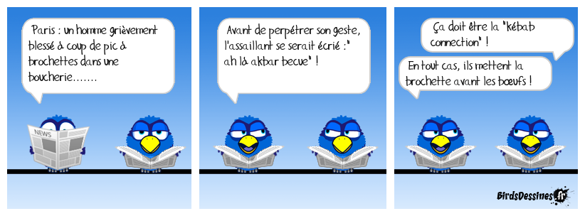 Case 1:Bird 1: Paris : un homme grièvement blessé à coup de pic à brochettes dans une boucherie....... | Case 2: Bird 1: Avant de perpétrer son geste, l'assaillant se serait écrié :" ah là akbar becue" ! | Case 3: Bird 1: Ça doit être la "kébab connection" ! Bird 2: En tout cas, ils mettent la brochette avant les bœufs !