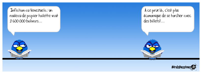 Case 1:Bird 1: Inflation au Venezuela: un rouleau de papier toilette vaut 2 600 000 bolivars... | Case 2: | Case 3: Bird 1: À ce prix là, c'est plus économique de se torcher avec des billets!...