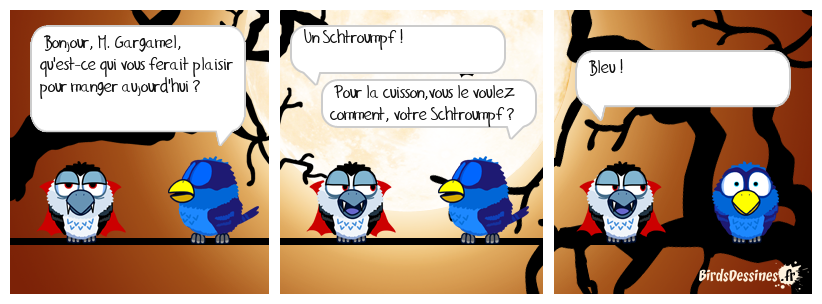 Case 1:Bird 1: Bonjour, M. Gargamel, qu'est-ce qui vous ferait plaisir pour manger aujourd'hui ? | Case 2: Bird 1: Un Schtroumpf ! Bird 2: Pour la cuisson,vous le voulez comment, votre Schtroumpf ? | Case 3: Bird 1: Bleu !