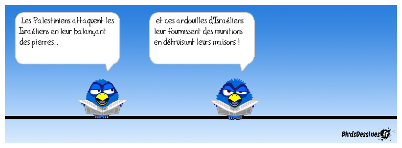 Case 1:Bird 1: Les Palestiniens attaquent les Israéliens en leur balançant des pierres.. | Case 2: Bird 1: et ces andouilles d'Israéliens leur fournissent des munitions en détruisant leurs maisons ! | Case 3: