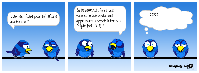 Case 1:Bird 1: Comment faire pour satisfaire une femme ? | Case 2: Bird 1: Si tu veux satisfaire une femme tu dois seulement apprendre ces trois lettres de l'alphabet: O. B. I. | Case 3: Bird 1: …….?????...….