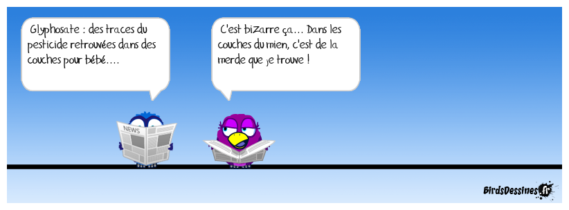 Case 1:Bird 1: Glyphosate : des traces du pesticide retrouvées dans des couches pour bébé.... | Case 2: Bird 1: C'est bizarre ça... Dans les couches du mien, c'est de la merde que je trouve ! | Case 3: