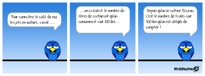 Case 1:Bird 1: Pour connaître le coût de nos trajets en voiture, avant..... | Case 2: Bird 1: ....on calculait le nombre de litres de carburant qu'on consommait aux 100 km.... | Case 3: Bird 1: Depuis qu'on se coltine Macron, c'est le nombre de taxes aux 100 km qu'on est obligés de compter !
