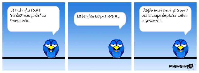 Case 1:Bird 1: Ce matin j'ai écouté "rendez-vous jardin" sur France Info... | Case 2: Bird 1: Eh ben j'en suis pas revenu... | Case 3: Bird 1: Jusqu'à maintenant je croyais que la cloque du pêcher c'était la grossesse !