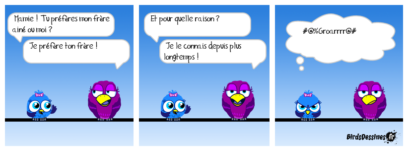 Case 1:Bird 1: Mamie ! Tu préfères mon frère ainé ou moi ? Bird 2: Je préfère ton frère ! | Case 2: Bird 1: Et pour quelle raison ? Bird 2: Je le connais depuis plus longtemps ! | Case 3: Bird 1: #@%Groarrrr@#