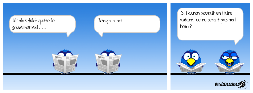 Case 1:Bird 1: Nicolas Hulot quitte le gouvernement..... | Case 2: Bird 1: Ben ça alors..... | Case 3: Bird 1: Si Macron pouvait en faire autant, ce ne serait pas mal hein ?