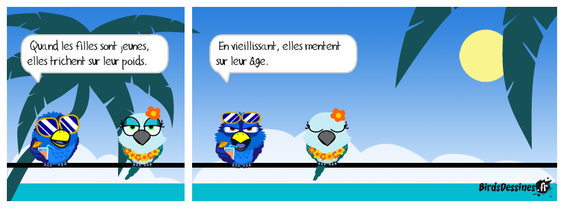 Case 1:Bird 1: Quand les filles sont jeunes, elles trichent sur leur poids. | Case 2: Bird 1: En vieillissant, elles mentent sur leur âge. | Case 3: