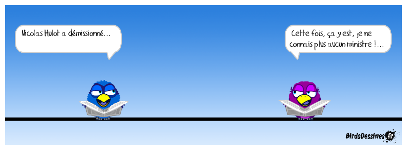 Case 1:Bird 1: Nicolas Hulot a démissionné... | Case 2: | Case 3: Bird 1: Cette fois, ça y est, je ne connais plus aucun ministre !...