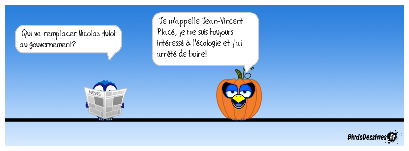 Case 1:Bird 1: Qui va remplacer Nicolas Hulot au gouvernement? | Case 2: Bird 1: Je m'appelle Jean-Vincent Placé, je me suis toujours intéressé à l'écologie et j'ai arrêté de boire! | Case 3: