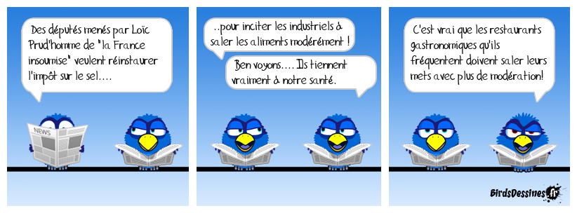 Case 1:Bird 1: Des députés menés par Loîc Prud'homme de "la France insoumise" veulent réinstaurer l'impôt sur le sel.... | Case 2: Bird 1: ..pour inciter les industriels à saler les aliments modérément ! Bird 2: Ben voyons.... Ils tiennent vraiment à notre santé. | Case 3: Bird 1: C'est vrai que les restaurants gastronomiques qu'ils fréquentent doivent saler leurs mets avec plus de modération!