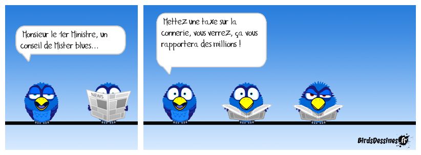 Case 1:Bird 1: Monsieur le 1er Ministre, un conseil de Mister blues... | Case 2: Bird 1: Mettez une taxe sur la connerie, vous verrez, ça vous rapportera des millions ! | Case 3:
