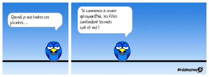 Case 1:Bird 1: Quand je vois toutes ces plaintes.... | Case 2: Bird 1: Je commence à croire qu'aujourd'hui, les filles confondent les mots coît et viol ! | Case 3: