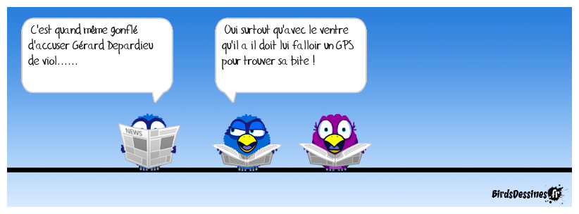 Case 1:Bird 1: C'est quand même gonflé d'accuser Gérard Depardieu de viol...... | Case 2: Bird 1: Oui surtout qu'avec le ventre qu'il a il doit lui falloir un GPS pour trouver sa bite ! | Case 3: