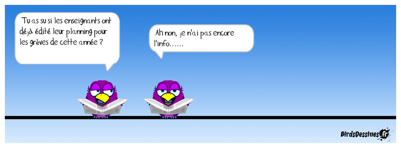 Case 1:Bird 1: Tu as su si les enseignants ont déjà édité leur planning pour les grèves de cette année ? | Case 2: Bird 1: Ah non, je n'ai pas encore l'info...... | Case 3: