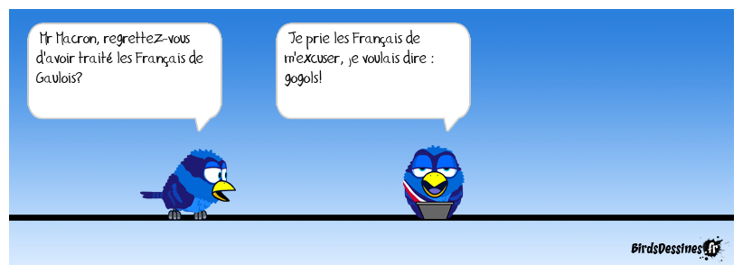 Case 1:Bird 1: Mr Macron, regrettez-vous d'avoir traité les Français de Gaulois? | Case 2: Bird 1: Je prie les Français de m'excuser, je voulais dire : gogols! | Case 3: