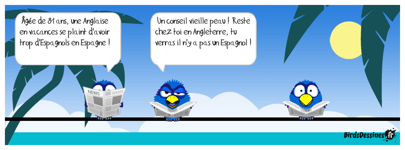 Case 1:Bird 1: Âgée de 81 ans, une Anglaise en vacances se plaint d'avoir trop d'Espagnols en Espagne ! | Case 2: Bird 1: Un conseil vieille peau ! Reste chez toi en Angleterre, tu verras il n'y a pas un Espagnol ! | Case 3: