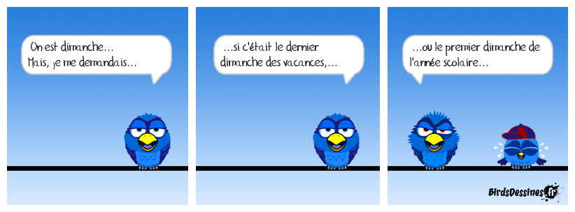 Case 1:Bird 1: On est dimanche... Mais, je me demandais... | Case 2: Bird 1: ...si c'était le dernier dimanche des vacances,... | Case 3: Bird 1: ...ou le premier dimanche de l'année scolaire...