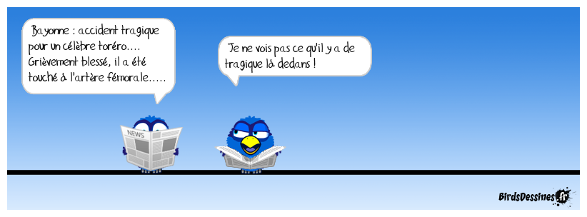 Case 1:Bird 1: Bayonne : accident tragique pour un célèbre toréro.... Grièvement blessé, il a été touché à l'artère fémorale..... | Case 2: Bird 1: Je ne vois pas ce qu'il y a de tragique là dedans ! | Case 3: