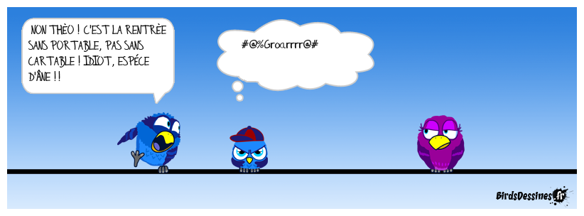 Case 1:Bird 1: NON THÉO ! C'EST LA RENTRÉE SANS PORTABLE, PAS SANS CARTABLE ! IDIOT, ESPÈCE D'ÂNE !! | Case 2: Bird 1: #@%Groarrrr@# | Case 3: