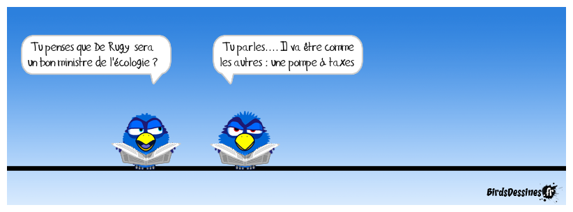 Case 1:Bird 1: Tu penses que De Rugy sera un bon ministre de l'écologie ? | Case 2: Bird 1: Tu parles.... Il va être comme les autres : une pompe à taxes | Case 3: