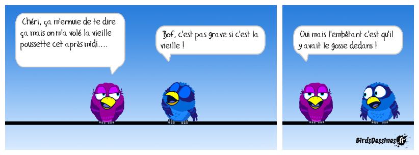 Case 1:Bird 1: Chéri, ça m'ennuie de te dire ça mais on m'a volé la vieille poussette cet après midi.... | Case 2: Bird 1: Bof, c'est pas grave si c'est la vieille ! | Case 3: Bird 1: Oui mais l'embêtant c'est qu'il y avait le gosse dedans !