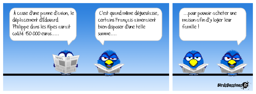 Case 1:Bird 1: À cause d'une panne d'avion, le déplacement d'Èdouard Philippe dans les Alpes aurait coûté 150 000 euros..... | Case 2: Bird 1: C'est quand même dégueulasse, certains Français aimeraient bien disposer d'une telle somme.... | Case 3: Bird 1: ...pour pouvoir acheter une maison afin d'y loger leur famille !