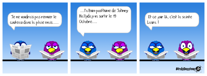 Case 1:Bird 1: Je ne voudrais pas remuer le couteau dans la plaie mais..... | Case 2: Bird 1: ...l'album posthume de Johnny Hallyday va sortir le 19 Octobre.... | Case 3: Bird 1: Et ce jour là, c'est la sainte Laura !