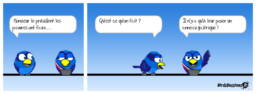 Case 1:Bird 1: Monsieur le président les pauvres ont faim.... | Case 2: Bird 1: Qu'est ce qu'on fait ? | Case 3: Bird 1: Il n'y a qu'à leur poser un anneau gastrique !