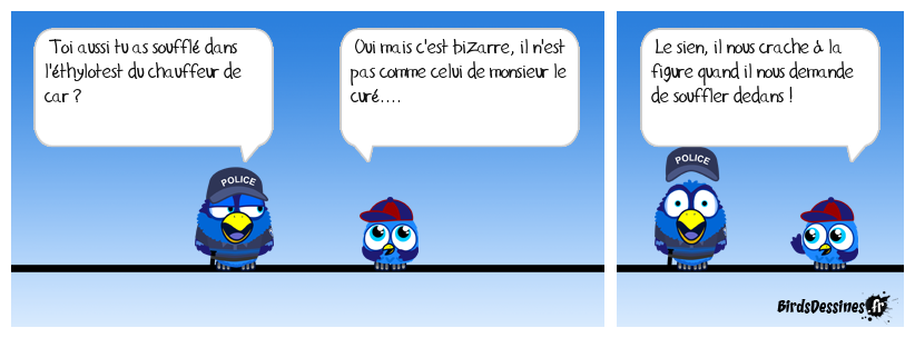Case 1:Bird 1: Toi aussi tu as soufflé dans l'éthylotest du chauffeur de car ? | Case 2: Bird 1: Oui mais c'est bizarre, il n'est pas comme celui de monsieur le curé.... | Case 3: Bird 1: Le sien, il nous crache à la figure quand il nous demande de souffler dedans !