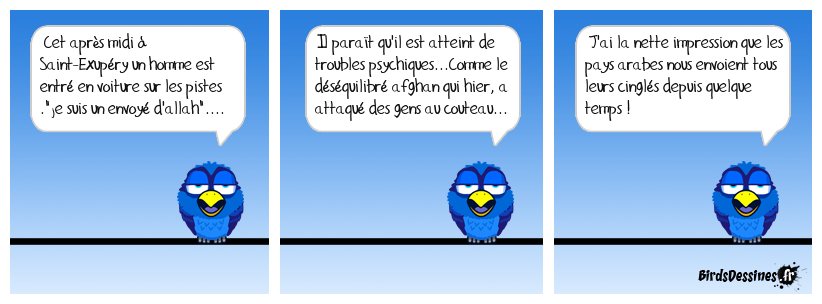 Case 1:Bird 1: Cet après midi à Saint-Exupéry un homme est entré en voiture sur les pistes ."je suis un envoyé d'allah".... | Case 2: Bird 1: Il paraît qu'il est atteint de troubles psychiques...Comme le déséquilibré afghan qui hier, a attaqué des gens au couteau... | Case 3: Bird 1: J'ai la nette impression que les pays arabes nous envoient tous leurs cinglés depuis quelque temps !