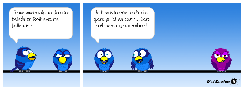 Case 1:Bird 1: Je me souviens de ma dernière balade en forêt avec ma belle-mère ! | Case 2: Bird 1: Je l'avais trouvée touchante quand je l'ai vue courir... Dans le rétroviseur de ma voiture ! | Case 3: