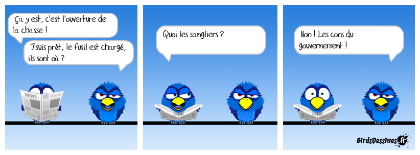 Case 1:Bird 1: Ça y est, c'est l'ouverture de la chasse !Bird 2: J'suis prêt, le fusil est chargé, ils sont où ? | Case 2: Bird 1: Quoi les sangliers ? | Case 3: Bird 1: Non ! Les cons du gouvernement !