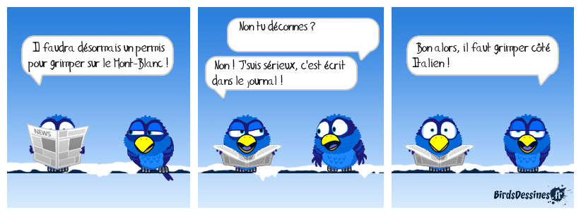 Case 1:Bird 1: Il faudra désormais un permis pour grimper sur le Mont-Blanc ! | Case 2: Bird 1: Non tu déconnes ? Bird 2: Non ! J'suis sérieux, c'est écrit dans le journal ! | Case 3: Bird 1: Bon alors, il faut grimper côté Italien !