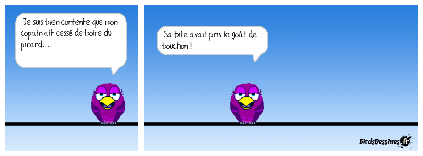 Case 1:Bird 1: Je suis bien contente que mon copain ait cessé de boire du pinard.... | Case 2: Bird 1: Sa bite avait pris le goût de bouchon ! | Case 3: