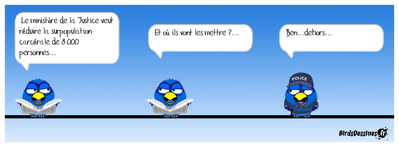 Case 1:Bird 1: Le ministère de la Justice veut réduire la surpopulation carcérale de 8 000 personnes... | Case 2: Bird 1: Et où ils vont les mettre ?... | Case 3: Bird 1: Ben...dehors...