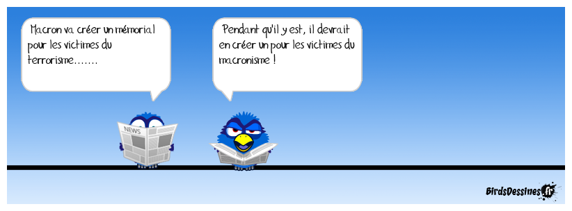 Case 1:Bird 1: Macron va créer un mémorial pour les victimes du terrorisme....... | Case 2: Bird 1: Pendant qu'il y est, il devrait en créer un pour les victimes du macronisme ! | Case 3:
