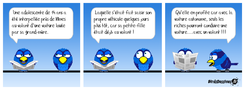Case 1:Bird 1: Une adolescente de 14 ans a été interpellée près de Nïmes au volant d’une voiture louée par sa grand-mère. | Case 2: Bird 1: Laquelle s’était fait saisir son propre véhicule quelques jours plus tôt, car sa petite-fille était déjà au volant ! | Case 3: Bird 1: Qu’elle en profite car avec la voiture autonome, seuls les riches pourront conduire une voiture....avec un volant !!!