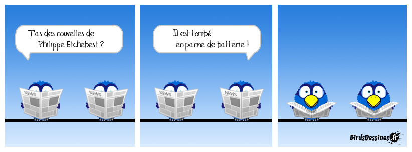 Case 1:Bird 1: T'as des nouvelles de Philippe Etchebest ? | Case 2: Bird 1: Il est tombé en panne de batterie ! | Case 3: