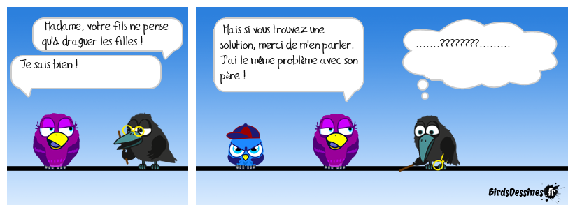 Case 1:Bird 1: Madame, votre fils ne pense qu'à draguer les filles !Bird 2: Je sais bien ! | Case 2: Bird 1: Mais si vous trouvez une solution, merci de m'en parler. J'ai le même problème avec son père ! | Case 3: Bird 1: .......????????.........